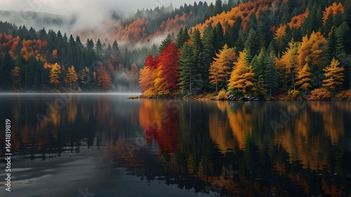 Fototapeta premium Autumn Lake with Misty Forest and Vibrant Foliage Reflections V5
