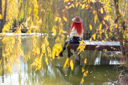 © svetograph, Obraz premium Autumn lake woman. In autumn, she sits by the pond on a wooden pier and admires nature with red hair and a hat. Tourism concept, weekend outside the city.