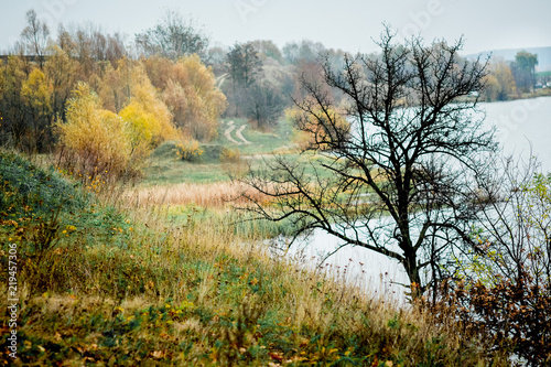 © Volodymyr, Fototapeta premium Autumn landscape: a black tree without leaves over the river, distant trees with yellow leaves_