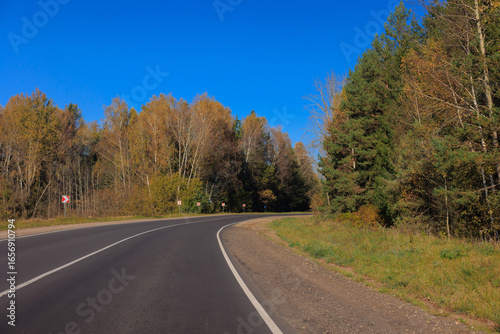 Fototapeta premium Autumn landscape and sunny evening, orange road and highway, asphalt and roadside.