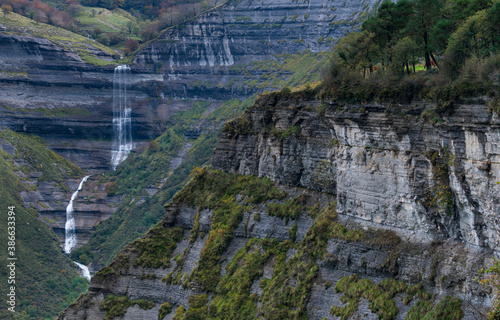 © JUAN CARLOS MUNOZ, Naklejka premium Autumn landscape at the San Miguel waterfall in the Angulo Valley of the Mena Valley in the Merindades of the province of Burgos. Castilla y Leon, Spain, Europe