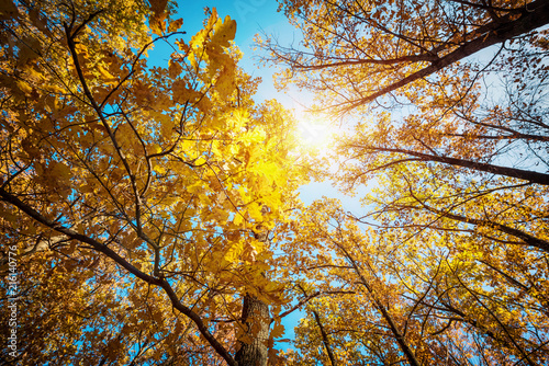© Tryfonov, Fototapeta premium Autumn landscape. Autumn tree leaves sky background.