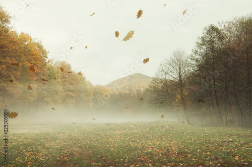 © andreiuc88, Fototapeta premium autumn landscape background with leaves falling in the wind
