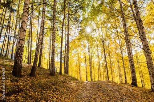 © Alwih, Obraz premium Autumn landscape. Beautiful birch trees. Walk in the birch forest. Natural background. Place to insert text.