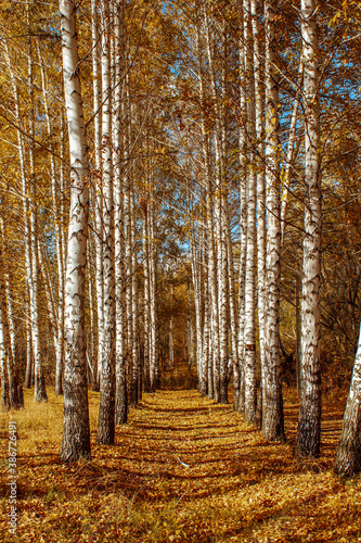 Fototapeta premium autumn landscape birch grove tall trees with white trunks and bright yellow leaves on a sunny day