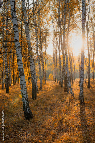 Fototapeta premium Autumn landscape birch park in the morning sun