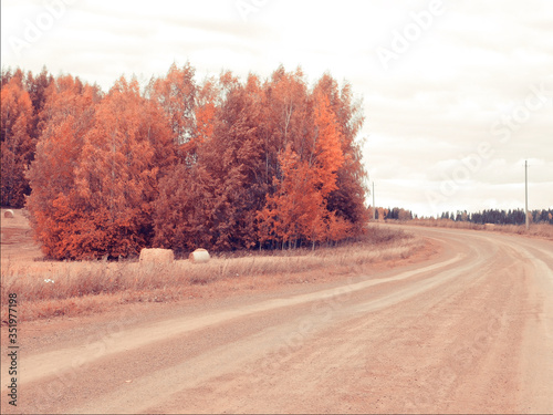 © lenaxf, Fototapeta premium Autumn landscape. Country rural road, forest, hay