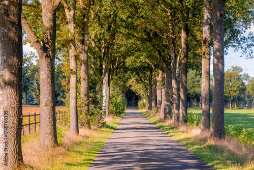 © Sarawut, Fototapeta premium Autumn landscape, Countryside road with farmland along the side, Tree trunk with green, yellow, orange leaves, Drenthe is a province of the Netherlands located in the northeastern part of the country.