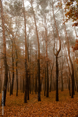 Fototapeta premium Autumn landscape - foggy morning, yellow leaves, trees,