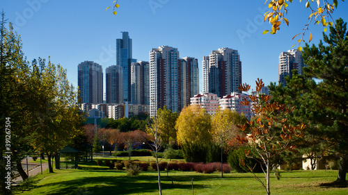 © Vahit Telli, Obraz premium Autumn landscape in front of tall buildings.