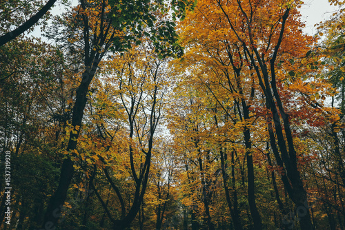 © Radoo, Fototapeta premium autumn landscape in park with many colors brown and green trees