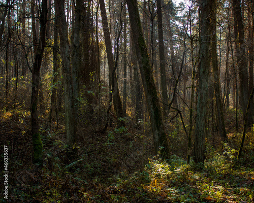 Fototapeta premium Autumn landscape: Morning forest with loose leaves, dark tree trunks and sunlight in the distance.