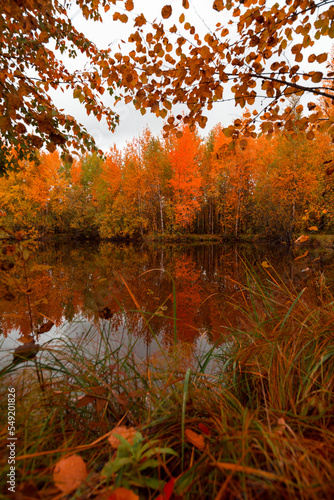 Fototapeta premium Autumn landscape near a forest lake covered with grass
