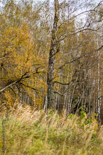 Fototapeta premium Autumn landscape on a cloudy day, field and forest in the background
