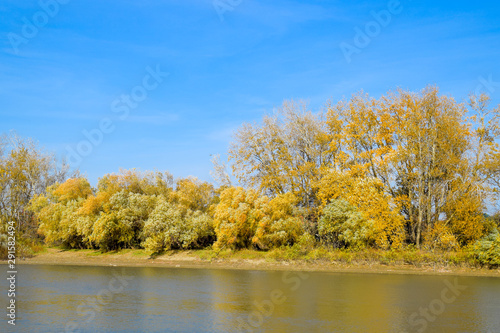 Fototapeta premium Autumn landscape. River bank with autumn trees. Poplars on the b
