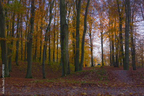 © Krzysztof, Fototapeta premium Autumn landscape, trees in the park forest green yellow red leaves branches, shimmering light warm sun nature views