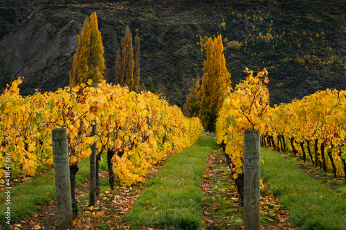 © Janice, Naklejka premium Autumn landscape view of yellow vineyard rows with the trees, Otago region, South Island of New Zealand