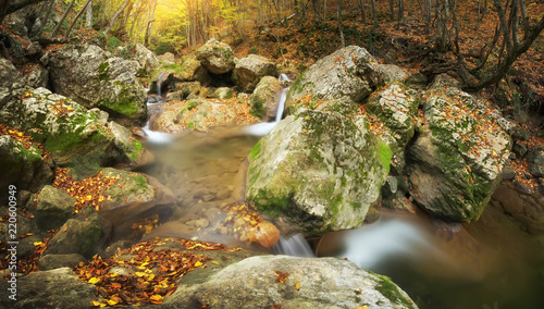 Fototapeta premium Autumn landscape waterfall river into canyon.
