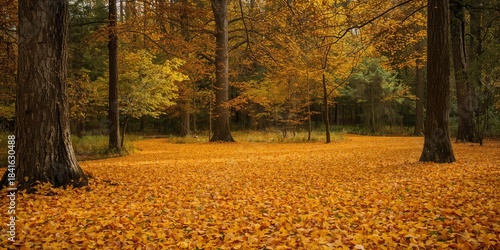 Naklejka premium Autumn landscape with a forest glade filled with yellow fallen leaves and...