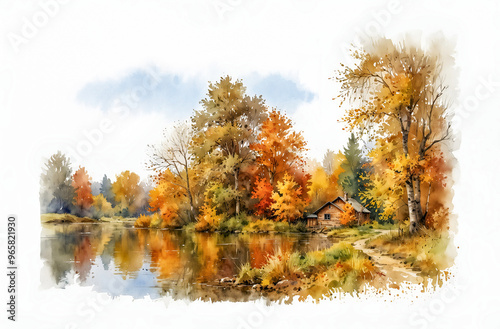 © Old Landscape, Fototapeta premium Autumn landscape with a house. Watercolor sketch on white paper