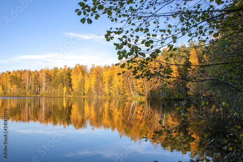 © Sergei, Fototapeta premium Autumn landscape with a pond. Trees with yellow foliage are reflected in the water.