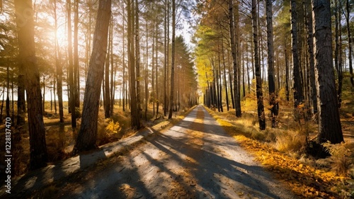© chysakibahmed, Obraz premium Autumn landscape with a road in the forest and sun rays.