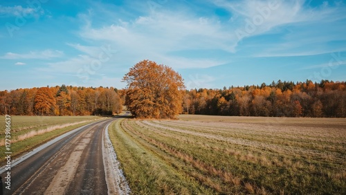 © Sona, Naklejka premium Autumn landscape with a road, trees with fall foliage, and fields under a blue sky.