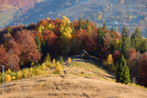 Fototapeta premium Autumn Landscape with a wooden house in the mountains