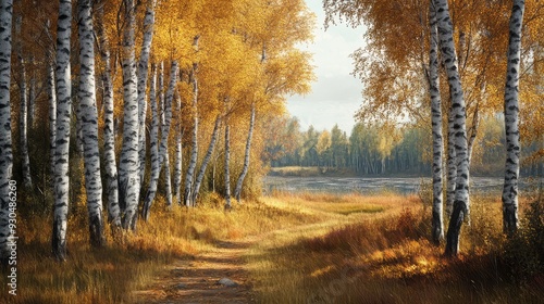 © Tunsale, Fototapeta premium Autumn landscape with birch trees. Ai generation