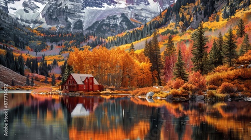 © bersch28, Fototapeta premium Autumn Landscape With Cabin and Mountain Reflection in Still Water