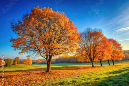 Naklejka premium Autumn landscape with changing leaves and bare trees against a clear blue sky, autumn, nature