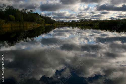 © Roberts Ratuts, Obraz premium Autumn landscape with colorful trees, grass and river. Reflection in river