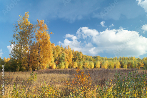 © ovcerleonid, Fototapeta premium Autumn landscape with floor and wood