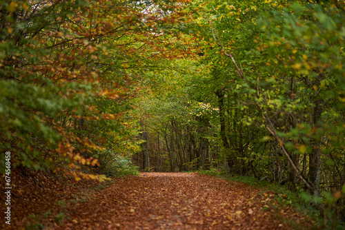 © Xalanx, Naklejka premium Autumn landscape with forest road covered in leaves