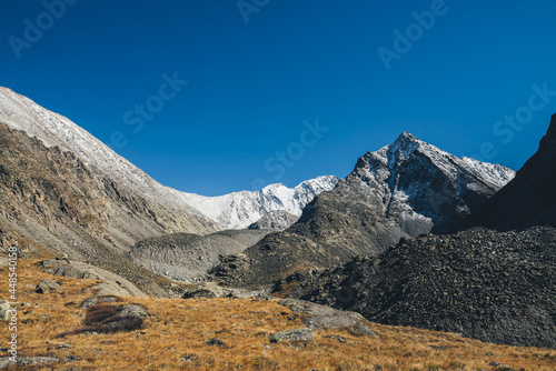 Fototapeta premium Autumn landscape with highland valley among snow-covered mountain range and pointy peak under blue sky. Atmospheric mountain scenery with sunlit orange valley in autumn colors among rocky mountains.