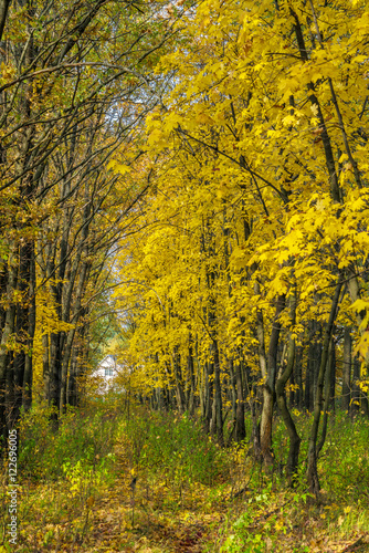 Fototapeta premium Autumn landscape with maple forest and fallen leaves