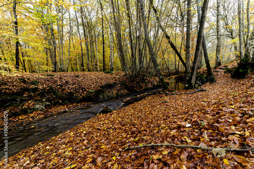© Tartalo, Obraz premium Autumn landscape with small river and ground covered by colorful leaves
