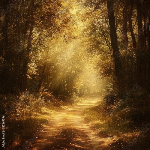 © Yiannos, Obraz premium Autumn landscape with sunbeams and forest. Digital painting.