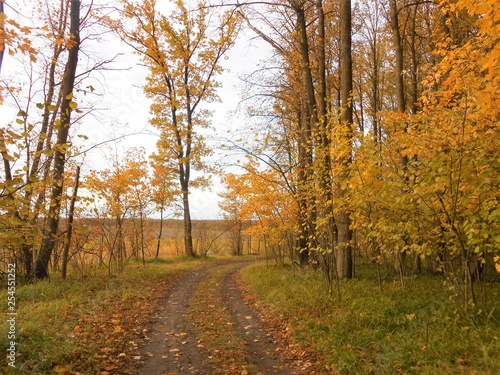 Fototapeta premium Autumn landscape with the dirt road in forest and trees on the sides with...