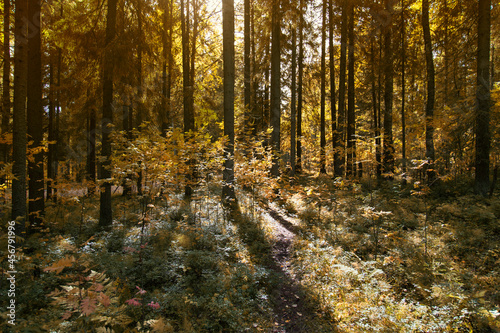 Obraz premium Autumn landscape with the sun in the autumn forest.