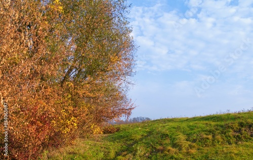 Naklejka premium Autumn landscape with trees, beautiful rural meadow, pasture