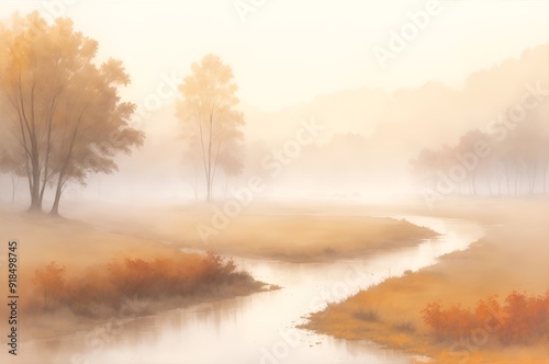 © Volodymyr, Naklejka premium Autumn landscape with trees on the river bank in the morning thick fog