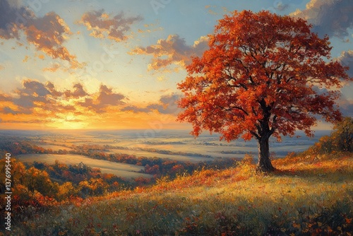 © Ulyana, Fototapeta premium Autumn Landscape with Vibrant Tree and Rolling Valley