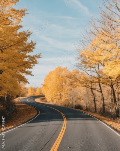 Fototapeta premium Autumn Landscape with Yellow Leaves Along an Empty Asphalt Road.