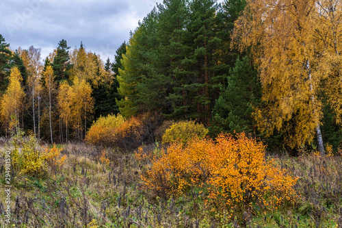 © Valery Smirnov, Fototapeta premium Autumn landscape with yellow leaves of birches and green spruces.