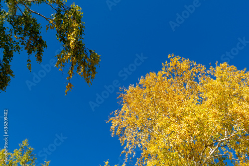 © Province_photo, Fototapeta premium Autumn landscape. Yellow autumn birch on a blue sky background.