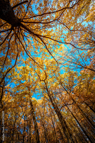 © Tryfonov, Obraz premium Autumn landscape. Yellow oak leaves on the branches in the old autumn forest.