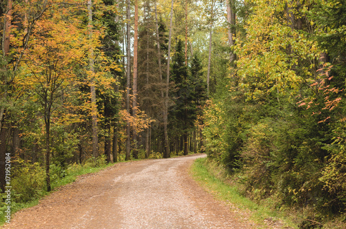© Maksim, Naklejka premium Autumn landscape, yellow trees, mountains, road