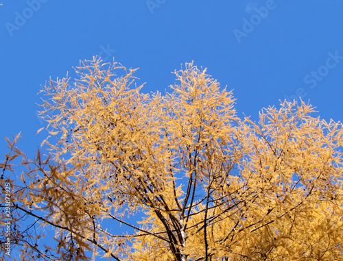 © Elijah, Fototapeta premium Autumn larch. Blue sky.