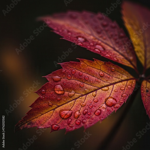 Obraz premium Autumn leaf close-up with glistening water droplets showcasing nature's...